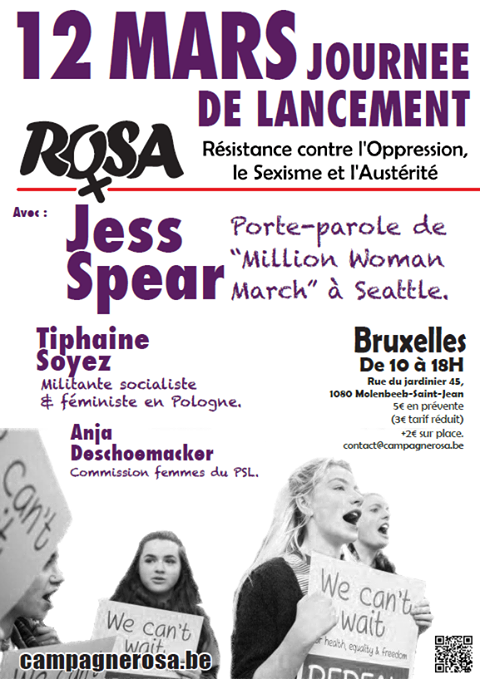 Ce 8 mars, la journée internationale de lutte pour les droits des femmes est marquée par la descente du #MeToo dans les rues. Avec la campagne ROSA, nous voulons participer à refaire de cette date une journée de lutte à travers diverses marches et actions dans 6 villes de Belgique contre le sexisme et la précarité. En Espagne et au Mexique, des grèves et manifestations contre les violences sexistes sont menées par Libres y Combativas, organisation sœur de la Campagne ROSA et, en Irlande, une marche #VoteForRepeal est organisée par ROSA Irlande pour exiger le retrait du 8e amendement de la Constitution irlandaise, qui interdit le droit à l’avortement. Le 31 mars, poursuivons la construction de la Campagne ROSA, outil de lutte contre l’oppression, le sexisme et l’austérité ! Une conférence nationale aura lieu à Bruxelles pour évaluer la première année de ROSA et continuer à construire un féminisme socialiste. Rejoins-nous !Par Mathilde (Liège)